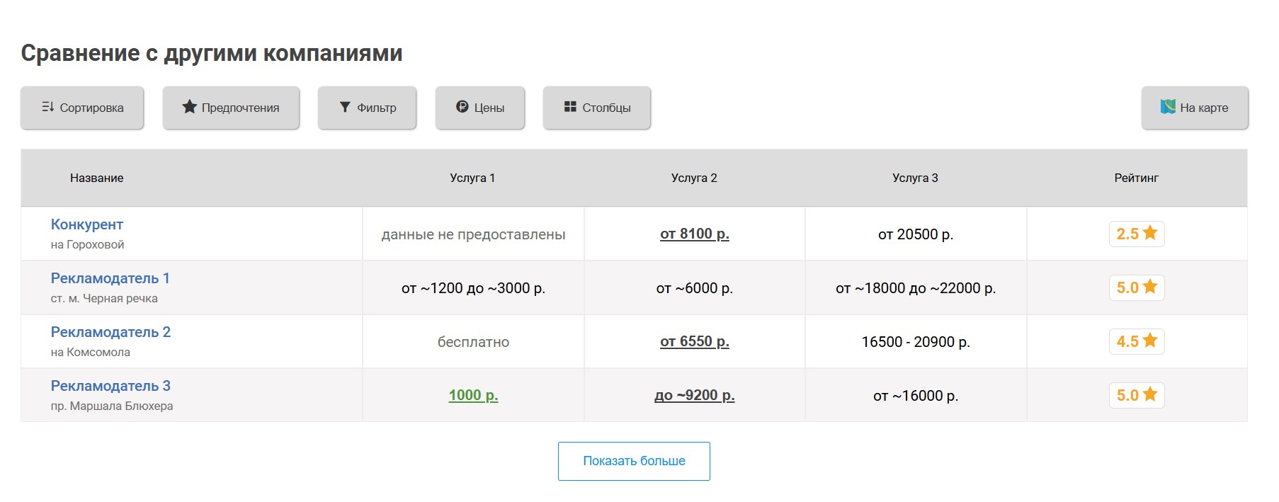Вокруг продвигаемой таким образом типографии выбирается некоторое количество ближайших конкурирующих типографий, продвигаемая типография попадёт к ним в таблицу «Сравнение по ценам», которая выглядит следующим образом: